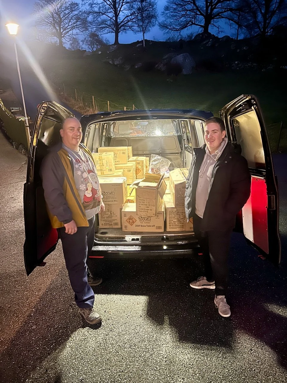 /Trond Egil og Odin Sivertsen foran den fullasta bilen med fognafyrverkeri!